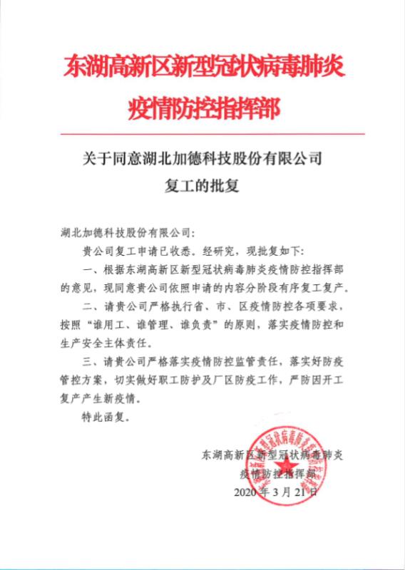 陽春三月,萬物復蘇。在公司領(lǐng)導及同事們的充分準備下,公司申請到了東湖高新區(qū)復工通知書。在武漢封城兩個月之后,我們終于迎來了這個新的春天。 為了保障大家安全的辦公環(huán)境,在公司正式復工的前兩天,公司領(lǐng)導及部分同事提前到達公司,對辦公場所做了全面消殺,防控物資準備到位,在大門口設(shè)立了...MORE →