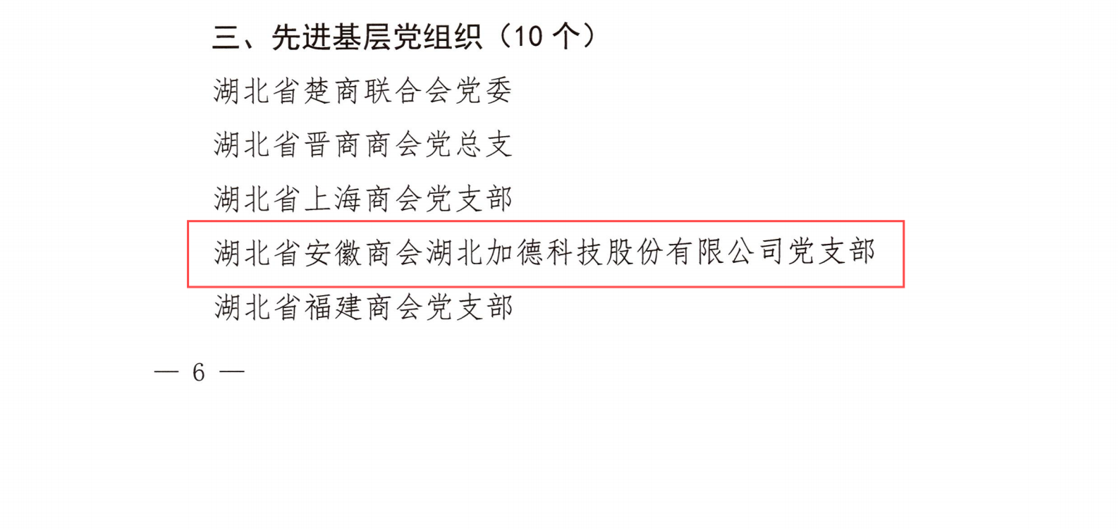 近日,在中國共產黨成立 103周年之際, 湖北加德科技股份有限公司 獲評省工商聯(lián)直屬商會 2023-2024年度先進基層黨組織。 一年來,省工商聯(lián)直屬商會各級黨組織團結帶領廣大民營經(jīng)濟人士堅持以習近平新時代中國特色社會主義思想為指導,全面貫徹落實黨的二十大精神,深入學習習近平總...MORE →