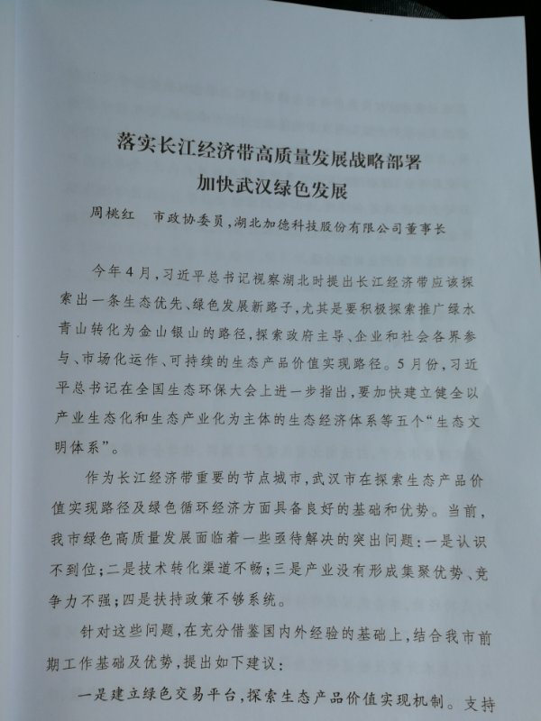 湖北加德科技股份有限公司董事長周桃紅作為武漢市政協(xié)代表應邀參加此次座談會,并作了題為《落實長江經(jīng)濟高質(zhì)量發(fā)展戰(zhàn)略部署,加快武漢綠色發(fā)展》的大會口頭發(fā)言。周桃紅董事長結(jié)合自己多年從業(yè)經(jīng)驗和深入調(diào)研結(jié)果,指出:武漢作為長江經(jīng)濟帶重要的節(jié)點城市,在探索生態(tài)產(chǎn)品價值實現(xiàn)路徑及綠色循環(huán)經(jīng)濟方面具備良好的基礎(chǔ)和優(yōu)勢。同時,周桃紅董事長也深入剖析了當前武漢綠色高質(zhì)量發(fā)展面臨的一些亟待解決的突出問題:一是認識不到位;二是技術(shù)轉(zhuǎn)化渠道不暢;三是產(chǎn)業(yè)沒有形成集聚優(yōu)勢、競爭力不強;四是扶持政策不夠系統(tǒng)。針對這些問題,周桃紅董事長在深入調(diào)研思考,并充分借鑒國內(nèi)外經(jīng)驗的基礎(chǔ)上,提出四點建議:一是建立綠色交易平臺,探索生態(tài)產(chǎn)品價值實現(xiàn)機制;二是建設(shè)長江國際低碳產(chǎn)業(yè)園,以點帶面發(fā)展綠色產(chǎn)業(yè);三是實施武漢生態(tài)工業(yè)園區(qū)工程,促進環(huán)保產(chǎn)業(yè)化;四是設(shè)立“兩山綠色發(fā)展基金”,為產(chǎn)業(yè)落地提供金融支撐。