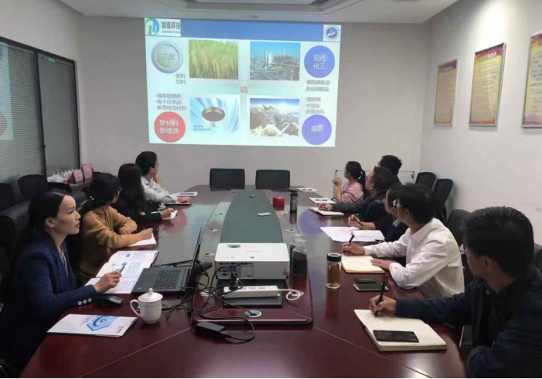 會上,張教授首先介紹了磷資源現(xiàn)有的利用情況及所在課題組的磷尾礦及磷石膏處理工藝,著重介紹了課題組最新研究成果“磷礦浮選尾礦循環(huán)酸浸制備硫酸鈣晶須”,并與我司技術(shù)人員共同討論了磷尾礦、磷石膏研究進展及技術(shù)推廣利用過程中存在的問題。
