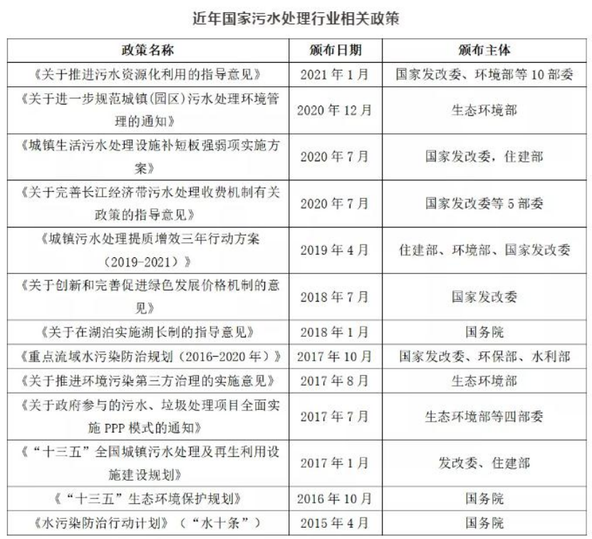 隨著我國經(jīng)濟(jì)不斷發(fā)展,生態(tài)問題日漸凸顯,政府對環(huán)保問題日趨重視,近年來,國家出臺多項(xiàng)污水處理相關(guān)政策,涉及水污染防治、污水處理市場化機(jī)制等多方面內(nèi)容,推動我國污水處理市場不斷規(guī)范化發(fā)展。