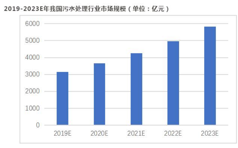 受國家政策支持、各方資本涌入、技術(shù)工藝革新等因素驅(qū)動,我國污水處理行業(yè)將持續(xù)快速發(fā)展,預(yù)計(jì)到2023年,我國污水處理行業(yè)市場規(guī)模將達(dá)到5820億元,2019-2023年復(fù)合增長率達(dá)14.7%。