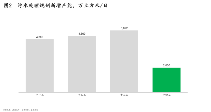 一是污水處理日漸成熟。近年我國城鎮(zhèn)污水處理任務(wù)已基本完成,城市污水處理率已經(jīng)達到95%以上,在“十四五”規(guī)劃中的污水處理新增產(chǎn)能也出現(xiàn)明顯下降(見圖2)。在污水處理漸趨飽和的情況下,先前遭到忽視的污泥處理問題重新得到關(guān)注。