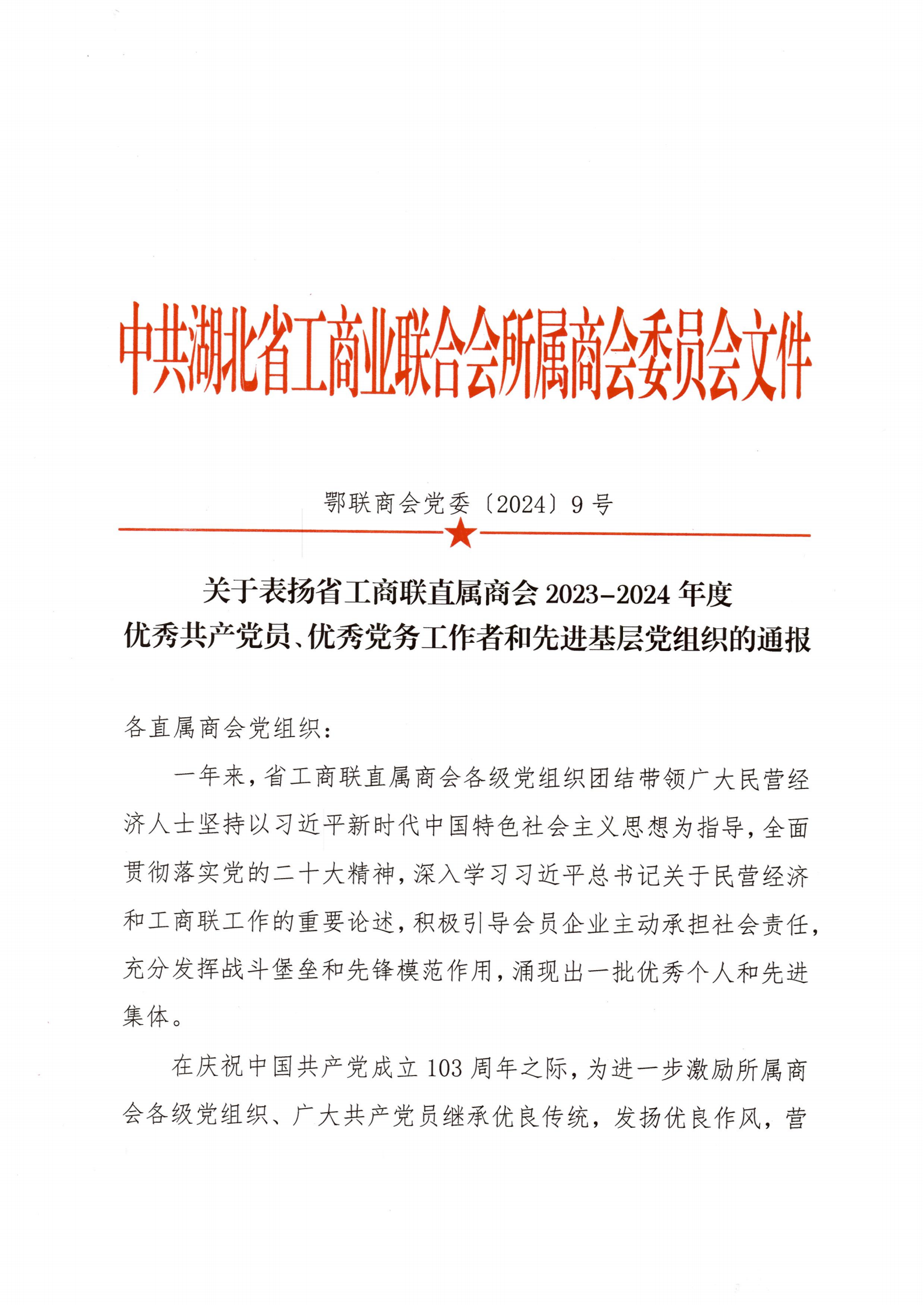 近日,在中國共產黨成立103周年之際,湖北加德科技股份有限公司獲評省工商聯直屬商會2023-2024年度先進基層黨組織。