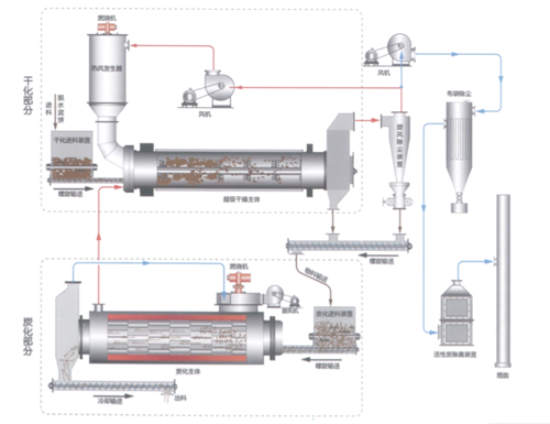 污泥干化炭化是利用清潔能源或可再生能源實(shí)現(xiàn)污泥干化脫水,并最終實(shí)現(xiàn)固定碳的保留。以此實(shí)現(xiàn)減排的目的,同時(shí)炭化產(chǎn)物可用作土壤改良劑、燃料、水處理吸附劑等。